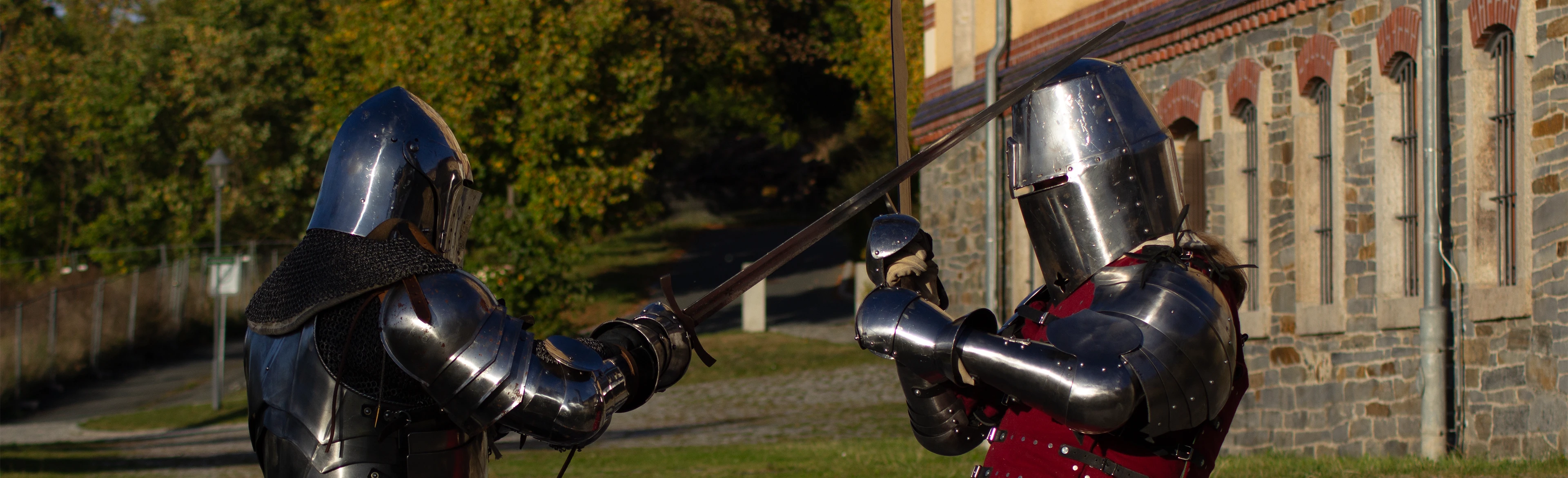 Wir trainieren mittelalterlichen Vollkontakt. Wir versuchen einem echten, gerüsteten Kampf, wie er hätte stattfinden können, so nah wie möglich zu kommen.